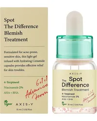 A targeted blemish treatment designed to calm AXIS-Y Spot the Difference Blemish Treatment, treat, and reduce breakouts without over-drying or irritating the skin. This fast-acting, non-comedogenic formula contains 4-terpineol (the active component of tea tree), centella asiatica, and patented anti-acne complex to reduce inflammation and promote healing. With added ceramides and moisturizing agents, it soothes active pimples while supporting the skin’s barrier. Ideal for spot-treating acne without disrupting surrounding healthy skin.
