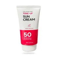 Stay radiant and protected with Collagen Pink Tone-Up Sun Cream SPF 50+ PA+++ by Pure Ground. This lightweight, non-greasy formula not only provides powerful sun protection but also helps to brighten and even out your skin tone with a natural pink glow. Enriched with collagen, it nourishes your skin, improves elasticity, and keeps it moisturized throughout the day. Perfect for daily use, this sun cream doubles as a tone-up base, leaving your skin looking flawless, fresh, and healthy.