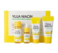 Travel-sized set flagship Yuja Niacin products comprises toner, serum, gel cream and sleeping mask, all infused with yuja extract as well as glutathione and arbutin for a bright, wrinkle-free finish. The toner contains 90% yuja extract to moisturize skin, while twelve kinds of vitamins combine with lotus flower extract to soothe irritated patches. The serum is infused with 82% yuja extract, which absorbs quickly into skin to leave it fully hydrated and glowing. The gel cream contains 90% yuja extract for moisture, ten kinds of vitamins to revitalize tired skin, and glacial water to produce an instant cooling effect. The sleeping mask hydrates and nourishes skin with a potent cocktail of 70% yuja extract, aquaxyl, Fructan as well as ten kinds of vitamins.